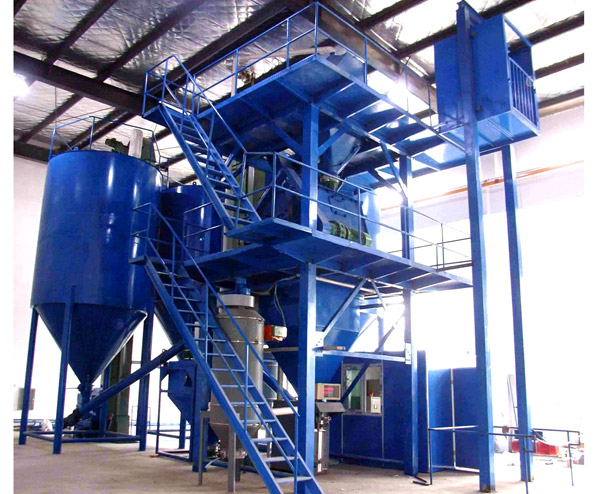 原料倉,自動計量配料及稱重裝置,斗式提升機,待混倉,高效混合機,喂料機,成品倉,自動稱量包裝機,脈沖除塵器,支架爬梯平臺,電器控制柜等組成。
